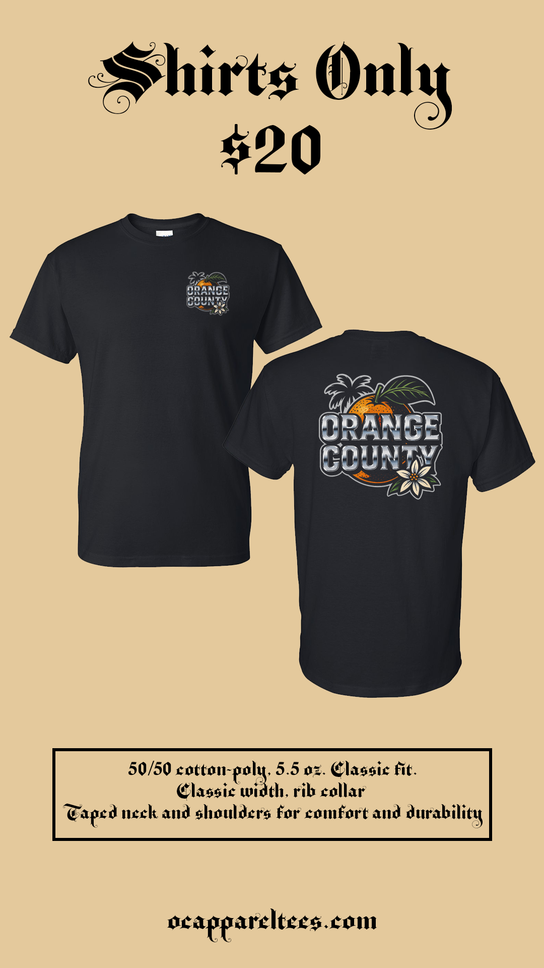 Rep the culture with this bold OC graphic tee. Featuring a detailed left-chest print and a full back design of a skeleton holding an orange, this shirt blends Orange County roots with classic streetwear style. Perfect for everyday wear, car meets, or anyone who loves OC vibes.