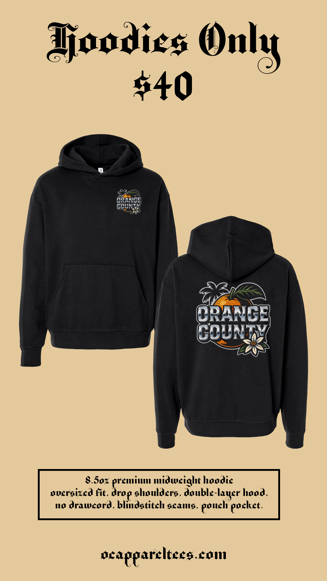 Hoodie Specs: 8.5oz premium midweight hoodie oversized fit, drop shoulders, double-layer hood, no drawcord, blindstitch seams, pouch pocket.